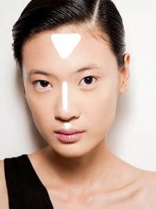 El truco es simple: resalta el centro de tu cara para crear el efecto de alargamiento. En solo tres puntos, la parte superior de la frente, el centro de la nariz y el arco de Cupido, atrae toda la atención en una línea y lejos de las áreas más amplias, como los lados de la cara. (No se requiere contorno)